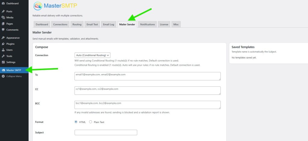 Mailer Sender is a built in tool in Master SMTP that lets you send manual emails directly from your WordPress dashboard. You can create and send emails using ready templates, add recipients, attachments, and custom content, then validate the details before sending. It is useful for testing your mail setup, sending quick messages, or creating one time emails without leaving your site.