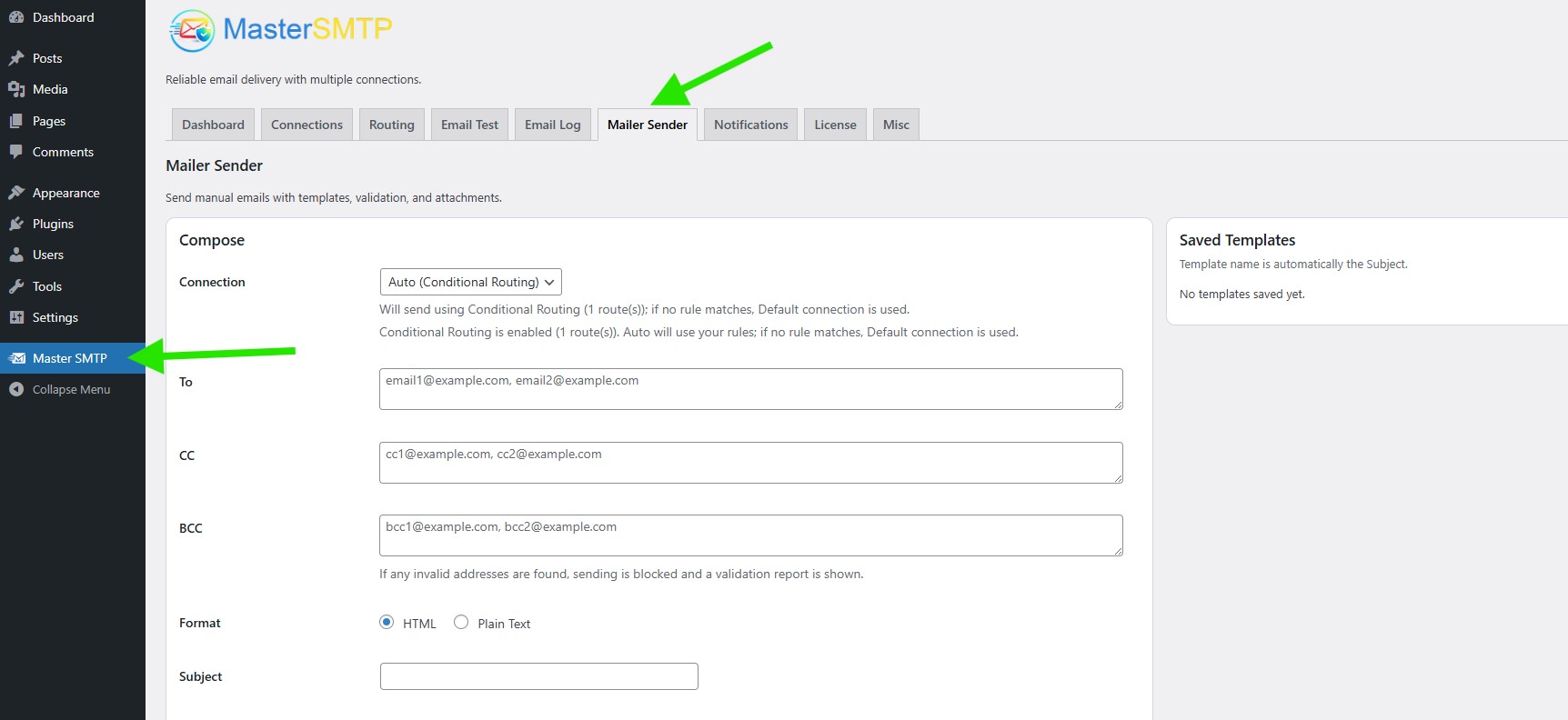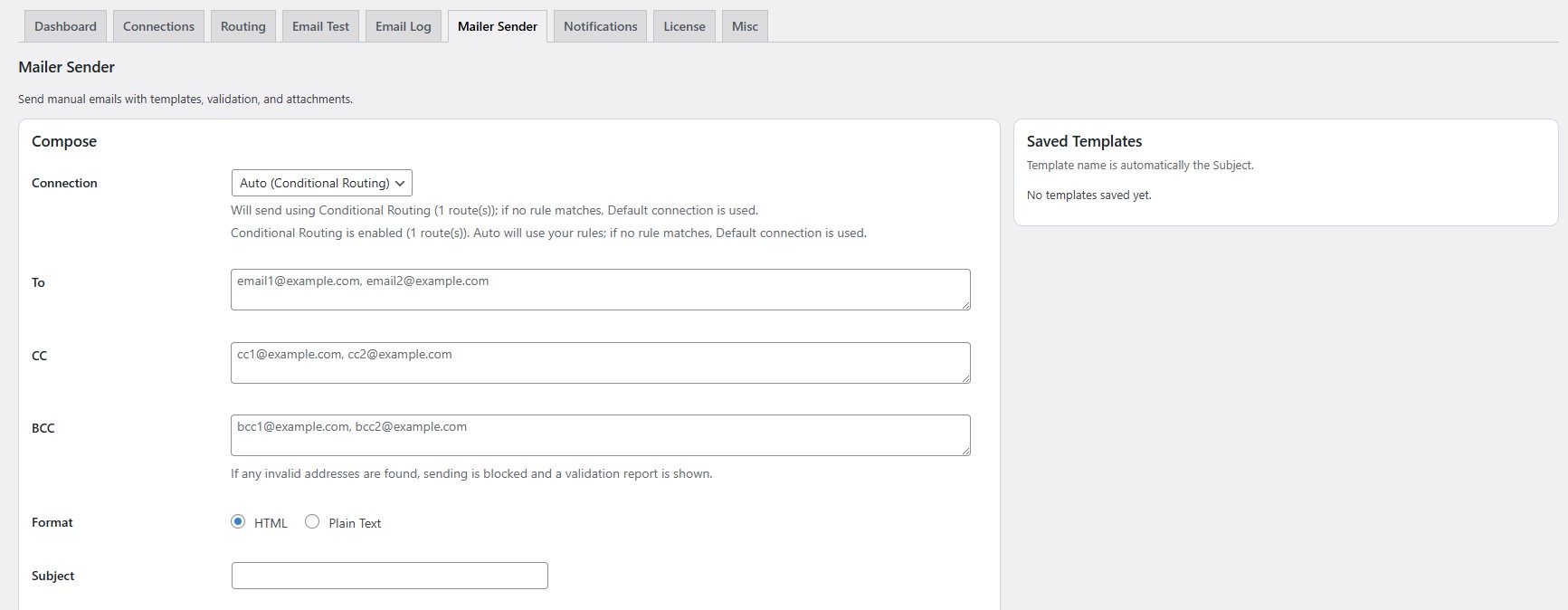 Connection: Select the mailer connection that should send this email. If you choose Auto (Conditional Routing), Master SMTP will try to match your routing rules first, and if no rule matches, it will use the default connection.