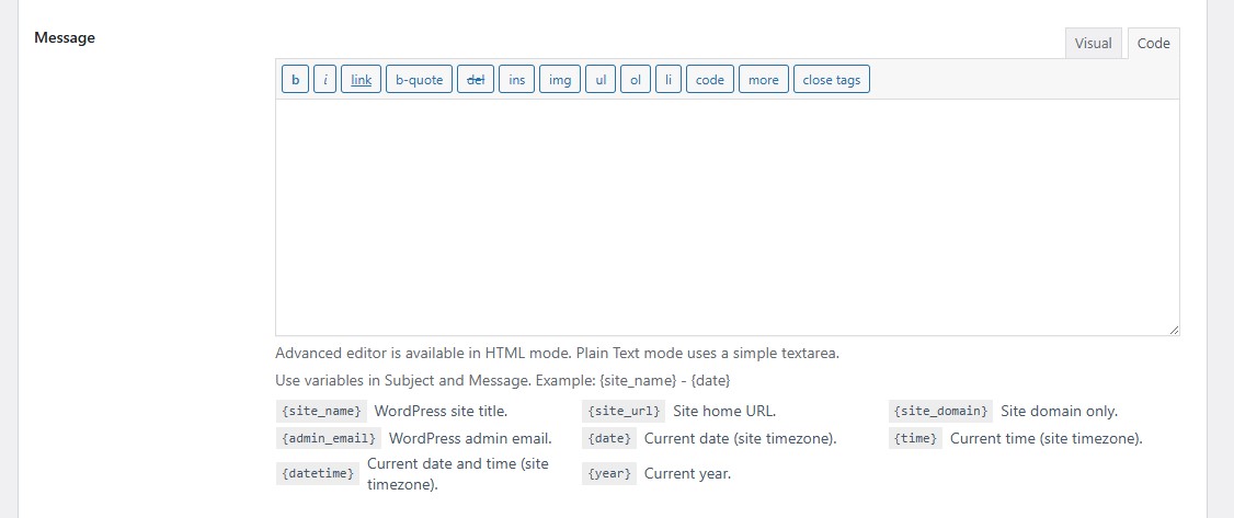 Message: This is where you write the email content. If HTML is selected in the Format option, you will see the advanced editor, which lets you format the message and use the Visual or Code mode. If Plain Text is selected, you will see a simple text box without formatting options.