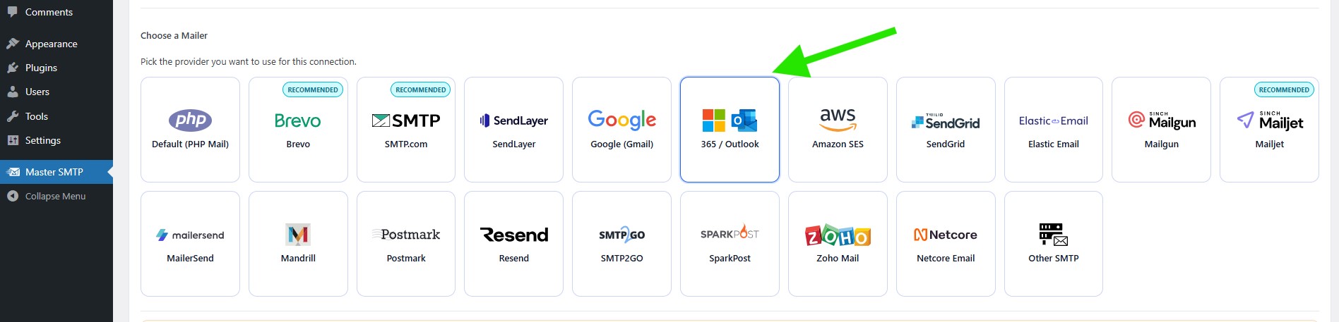 In the Choose a Mailer section, select 365 / Outlook from the grid mailer list.