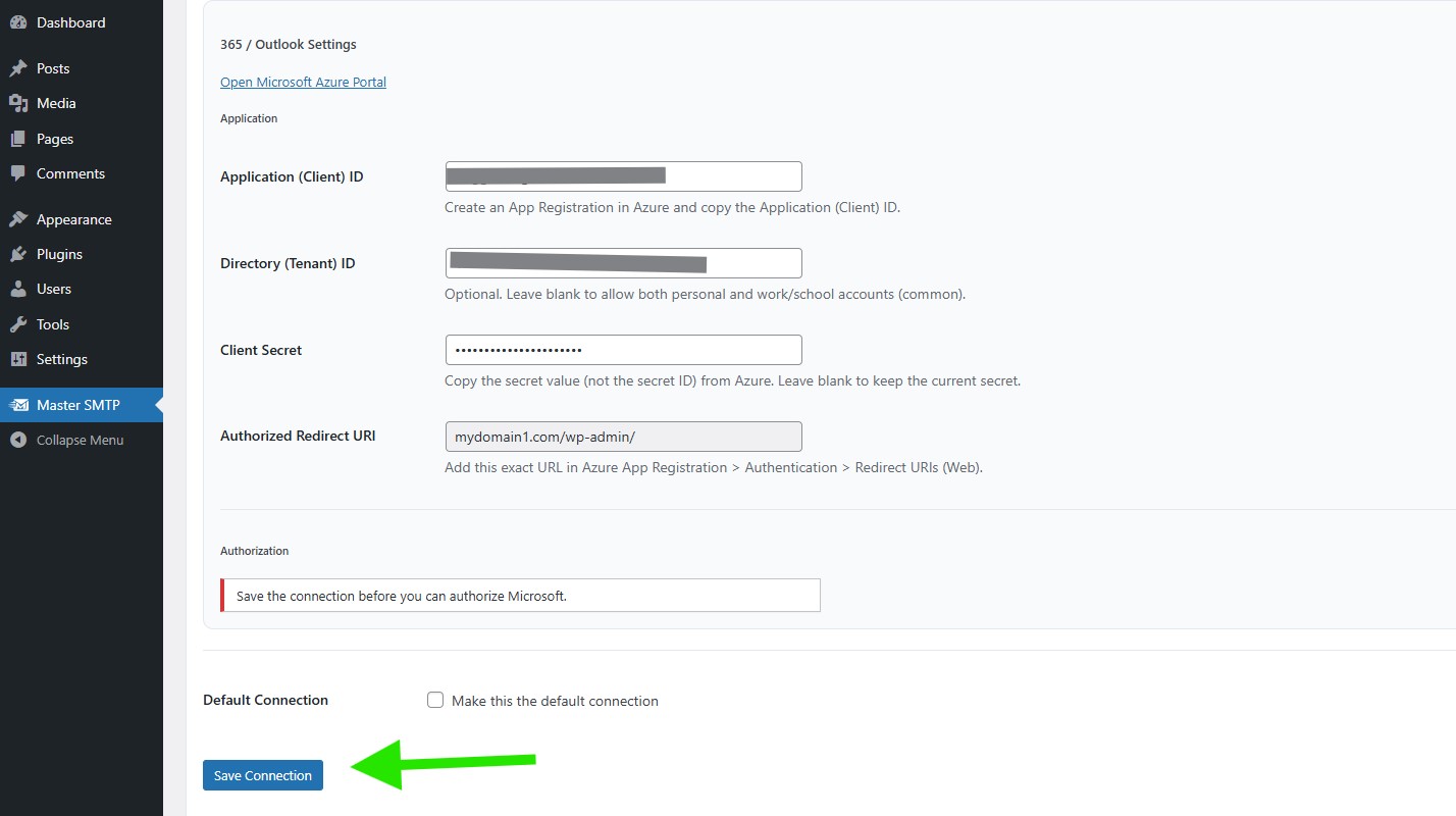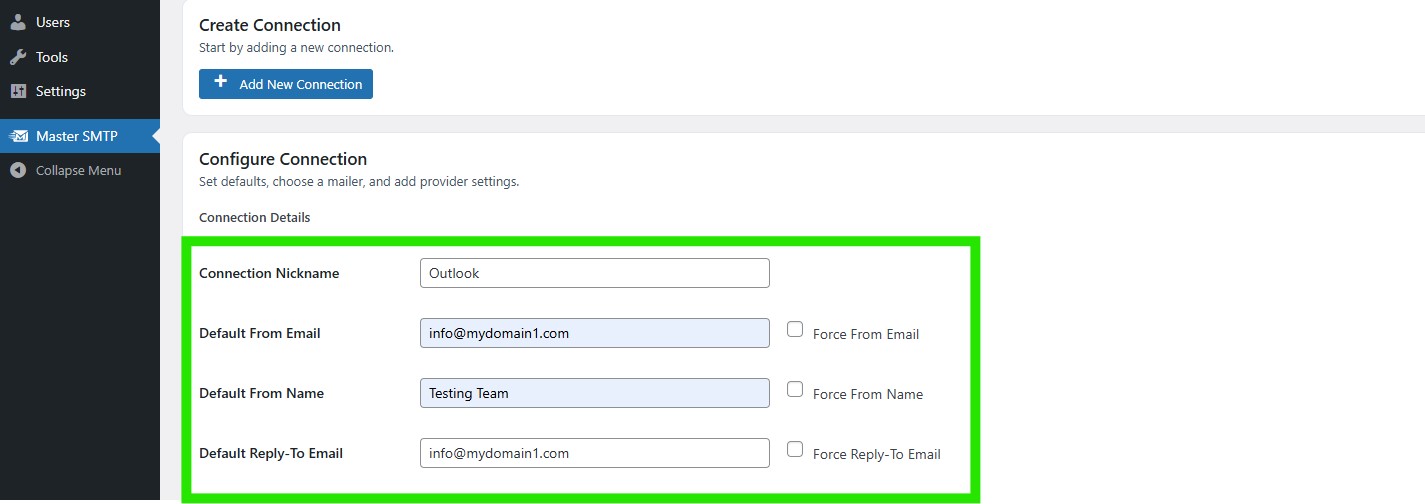 In your WordPress dashboard, go to Master SMTP > Connections, then click Create New Connection.