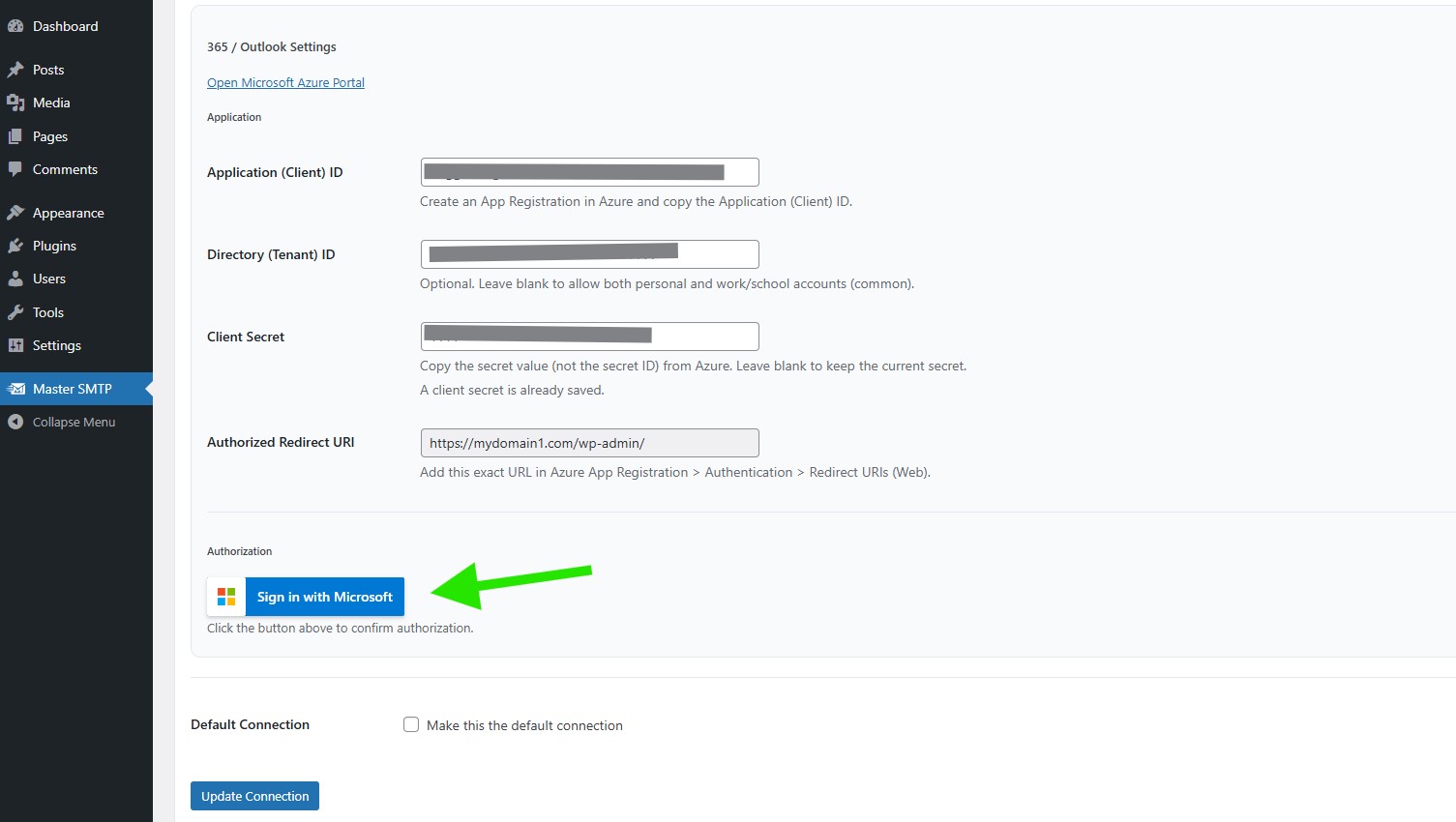 After saving the connection, the Sign in with Microsoft button will appear. Click it to connect your Microsoft account and complete the authorization process.