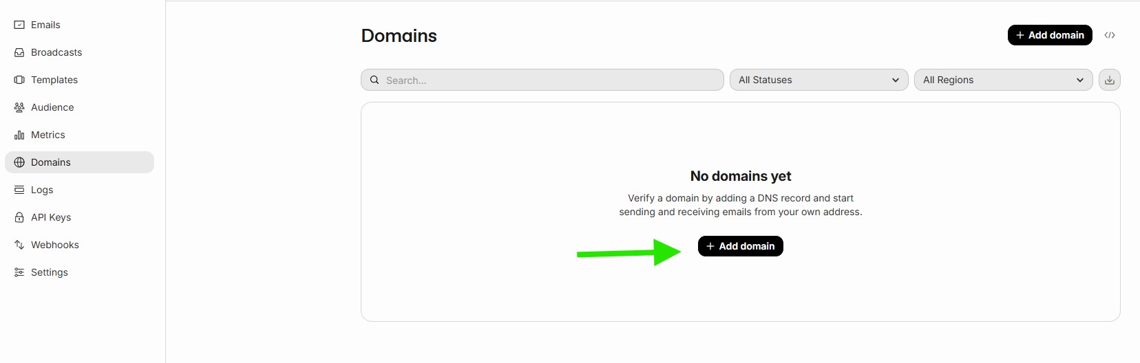 To add a sending domain, log in to your Resend account and go to Domains from the left sidebar, or visit https://resend.com/domains.