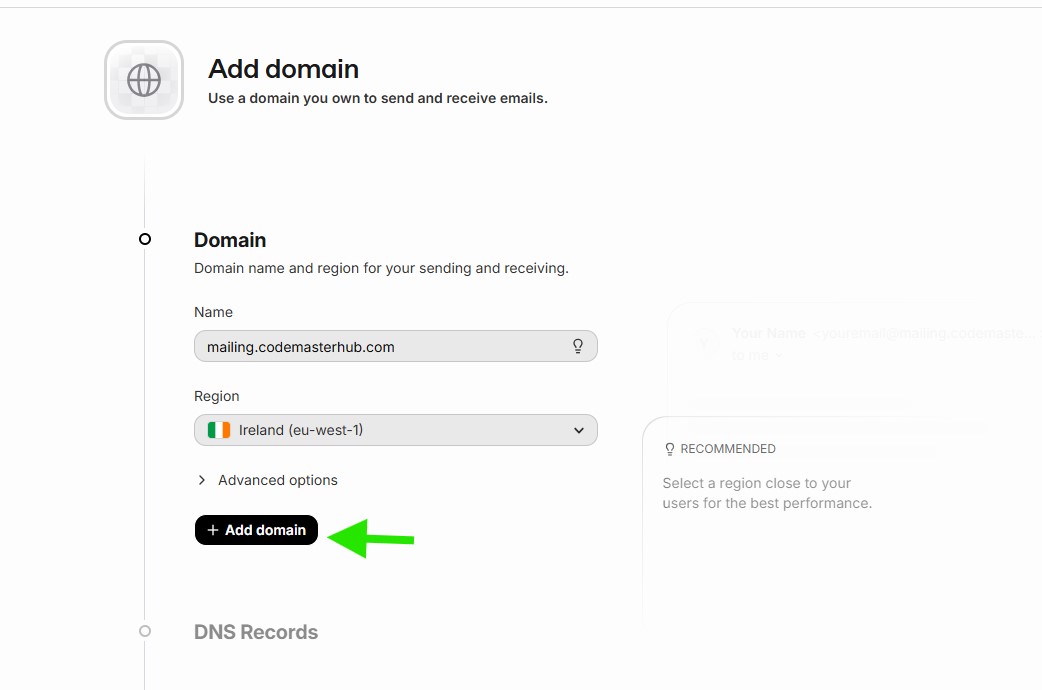 Domain: Using a subdomain is recommended, such as mail.yourdomain.com or mailing.yourdomain.com. This can still be used for sending emails for addresses on your main domain, depending on your setup.