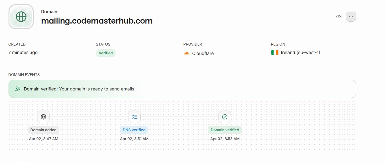 Note: Domain verification may take a few minutes after the DNS records are added.