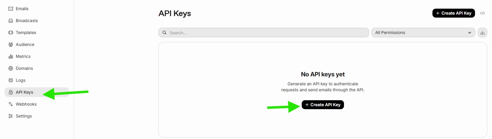 To create your Resend API key, click API Keys from the left sidebar, or visit https://resend.com/api-keys.