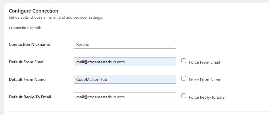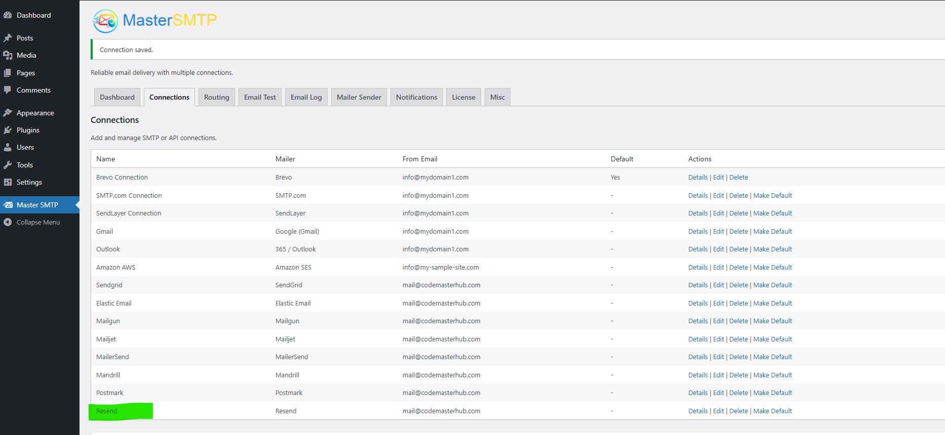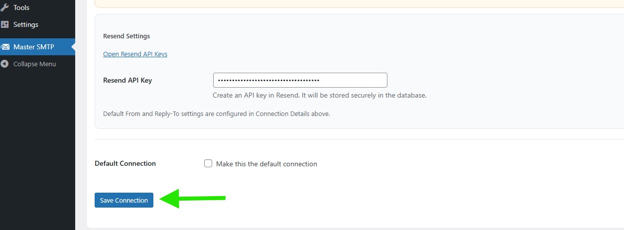 If you want to use Resend as your main mailer, enable Make this the default connection, then click Save Connection.