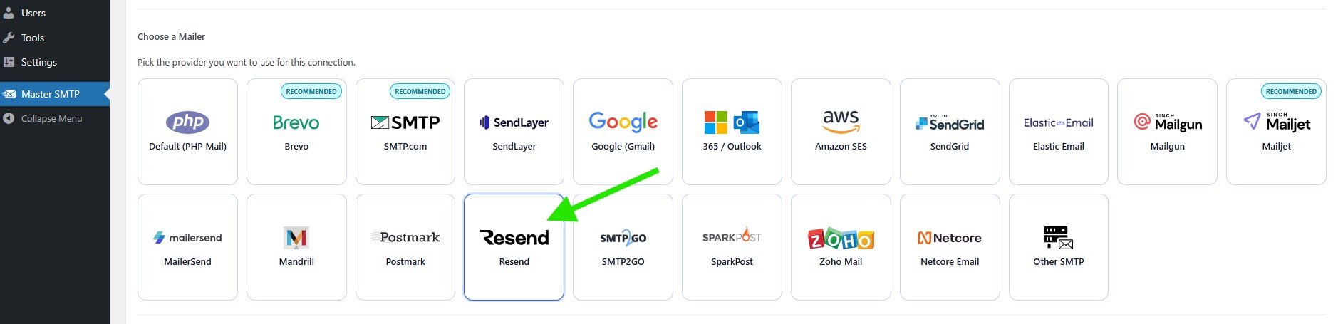 In the Choose a Mailer section, select Resend from the grid mailer list.
