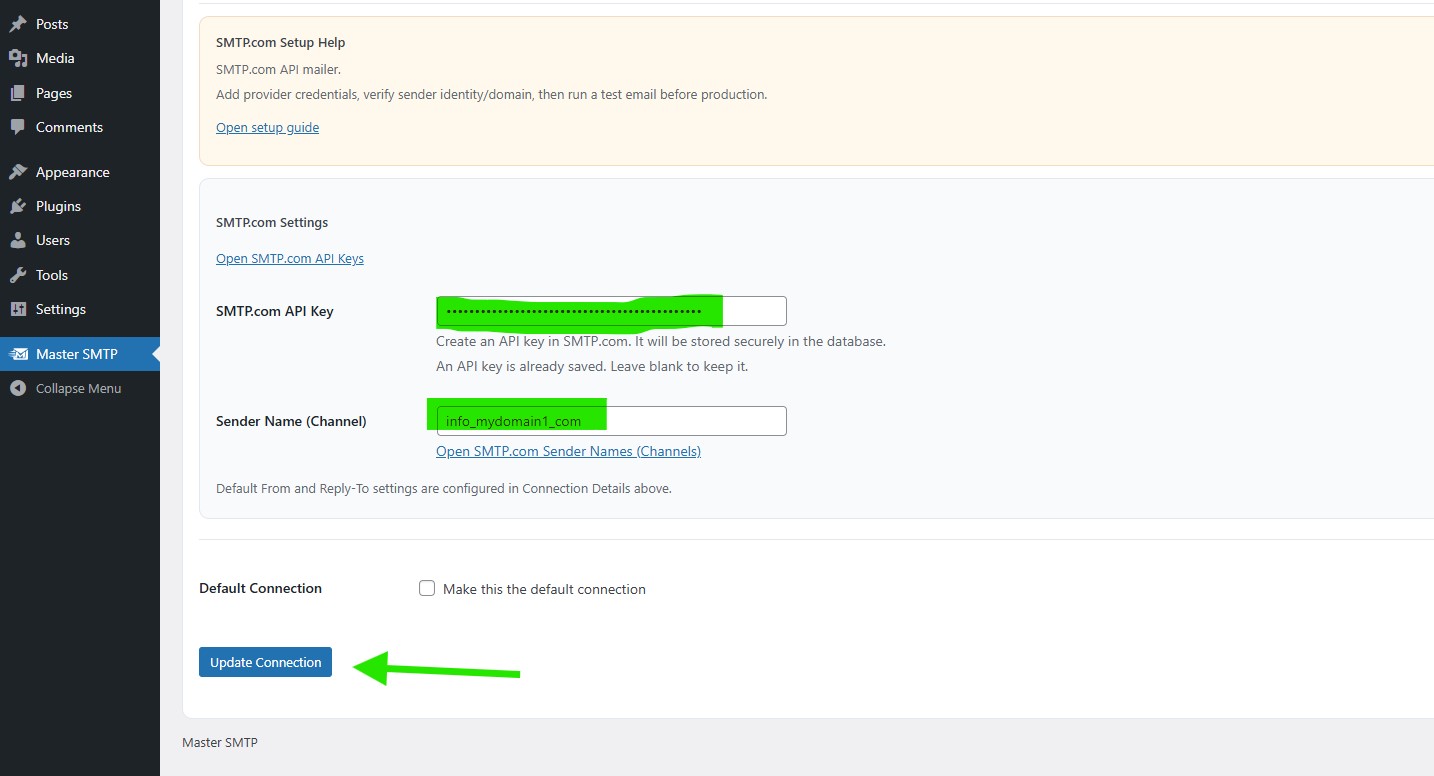 Once you have your API Key and Sender Name, return to Master SMTP and enter them in the corresponding fields to continue the setup.