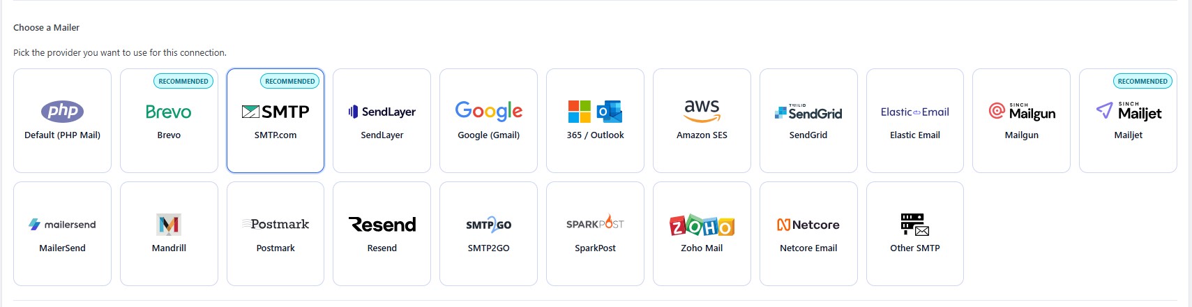 In the Choose a Mailer section, select SMTP.com from the mailers grid list. This will load the SMTP.com connection settings so you can enter the required account details and complete the setup.