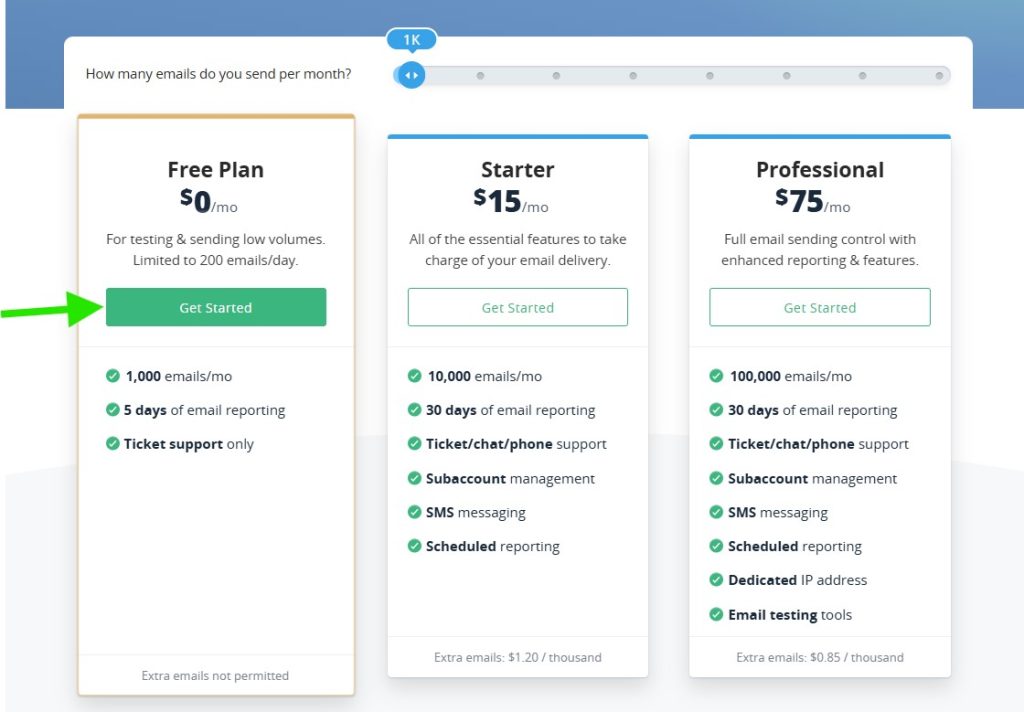 To create your SMTP2GO account, visit the pricing page and choose a plan that fits your needs. In this example, we use the Free plan, which is a good option for testing and small websites.