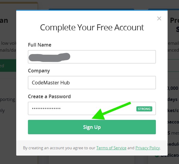 Next, enter your full name, company name, and create a password for your SMTP2GO account. When ready, click Sign Up to continue.