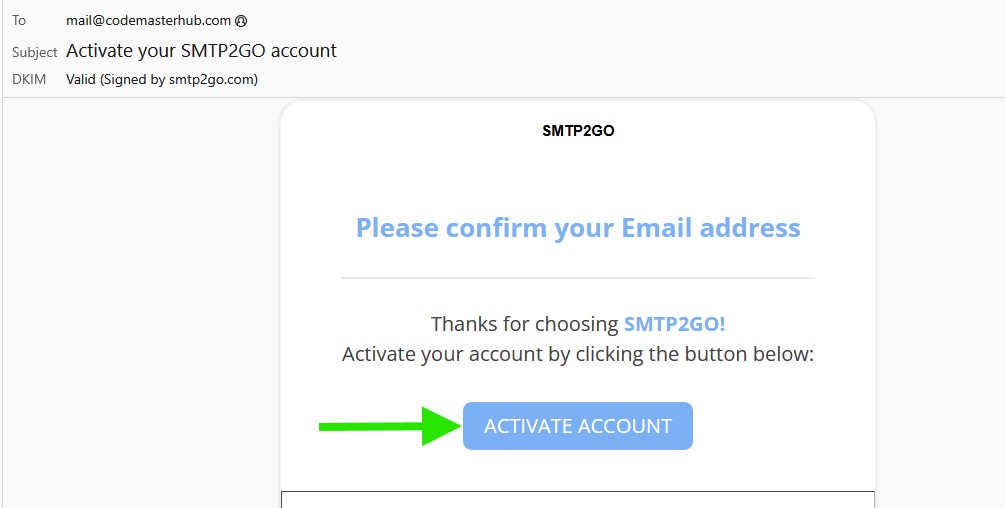 After signing up, check your inbox for the SMTP2GO account activation email. Open the email and click Activate Account to verify your email address and continue.