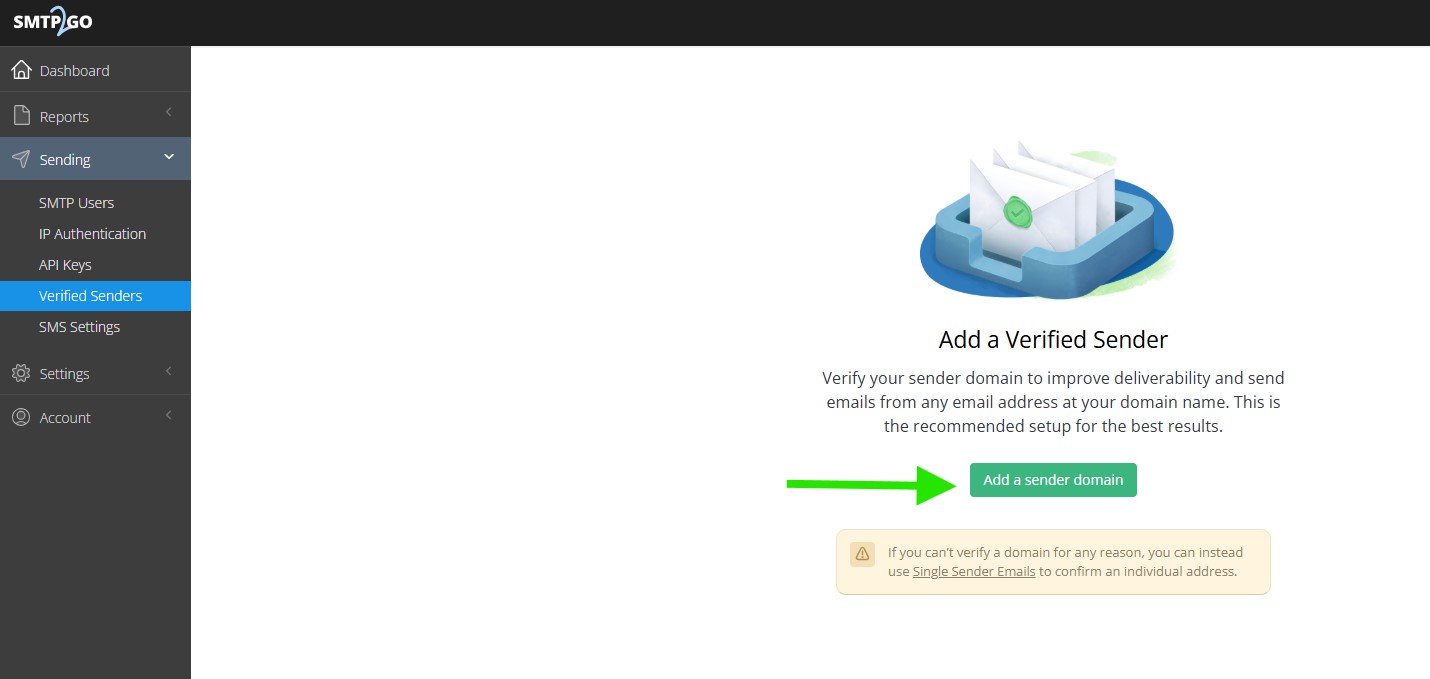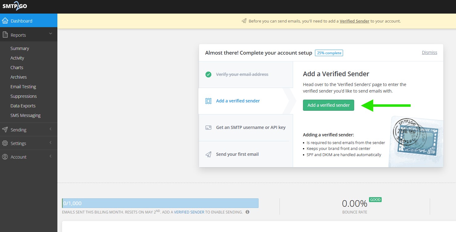 After verifying your email address, you will be redirected to your SMTP2GO dashboard. From there, click Add a verified sender to continue. You can also go directly to the Verified Senders page by visiting https://app.smtp2go.com/sending/verified_senders/.