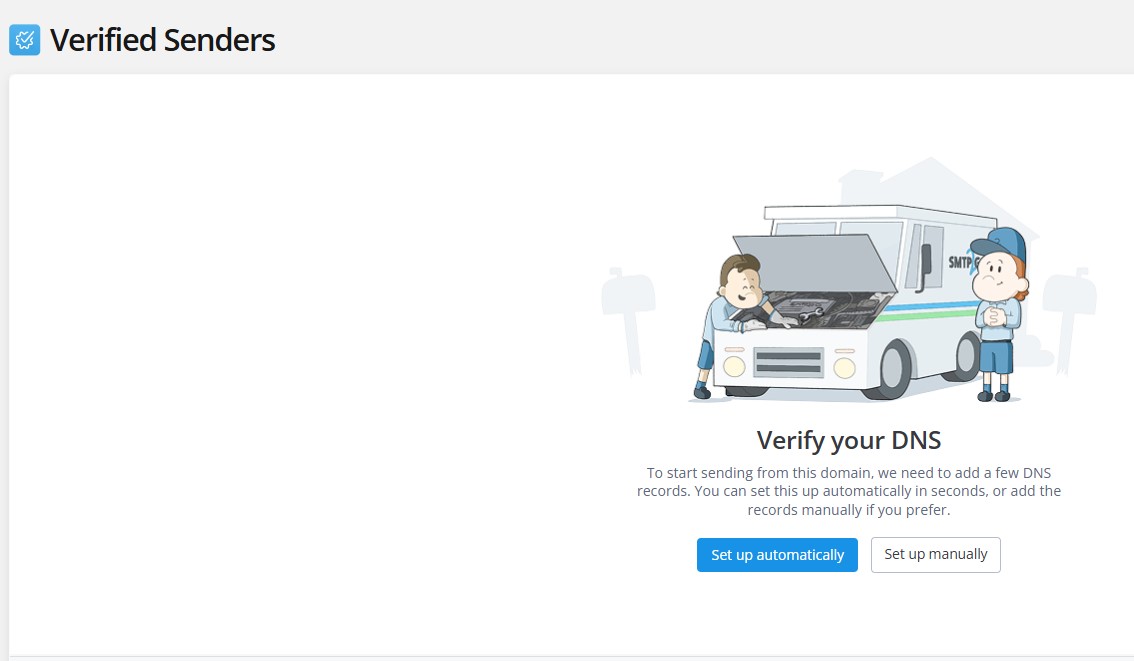 SMTP2GO will now ask you to verify your DNS. At this step, you can choose Set up automatically if your DNS provider is supported, or Set up manually to add the required DNS records yourself.