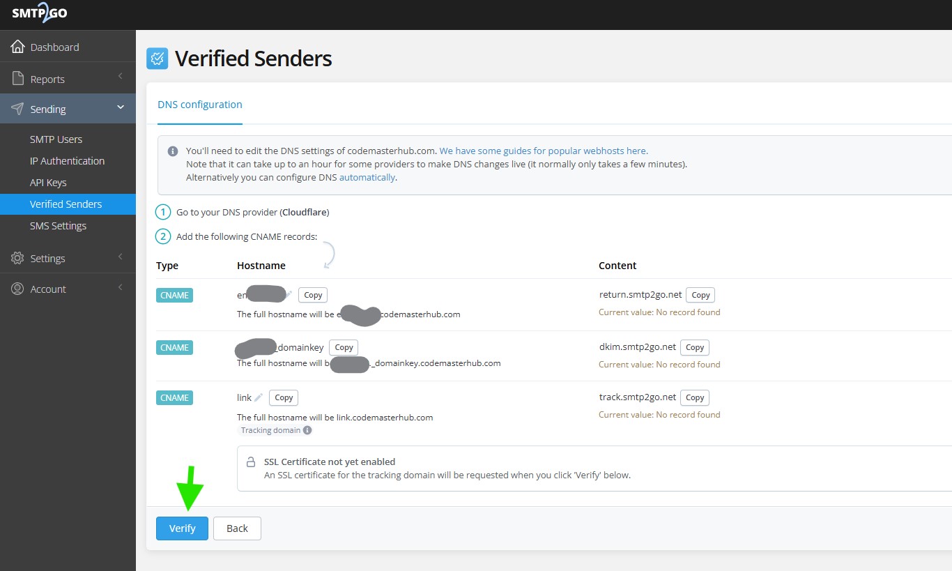 If you selected automatic setup, follow the prompts to let SMTP2GO add the DNS records for you. If you selected manual setup, add the required DNS records at your DNS provider, then return to SMTP2GO and click Verify.