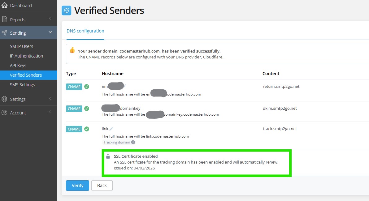 After adding the DNS records, click Verify. If you see that the SSL certificate for the link CNAME is still pending, wait a few minutes and click Verify again. In some cases, you may need to try again until the domain and SSL certificate are fully verified.