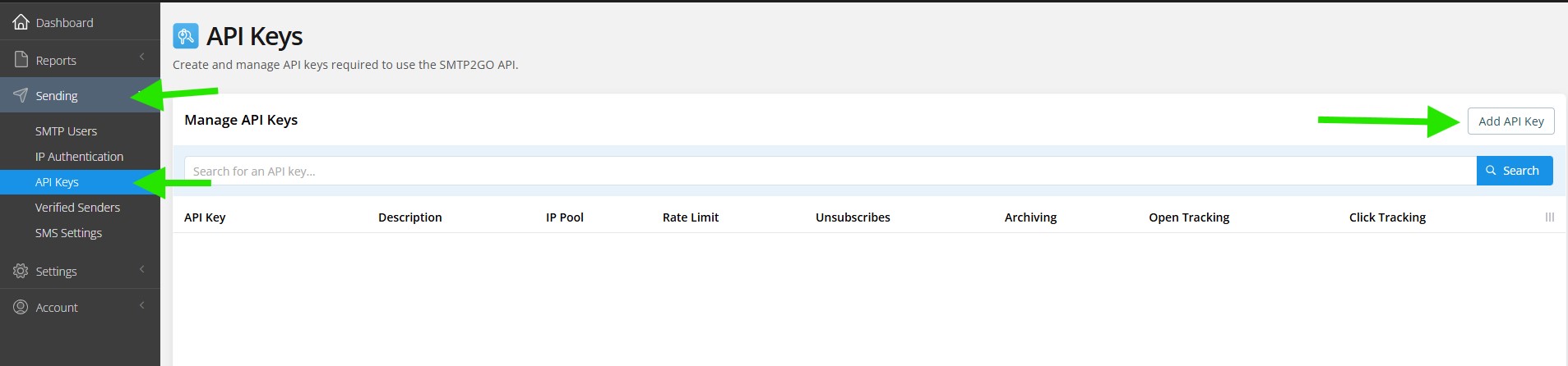 To create an API key in SMTP2GO, go to Sending in the left sidebar, then open API Keys. After that, click Add API Key.