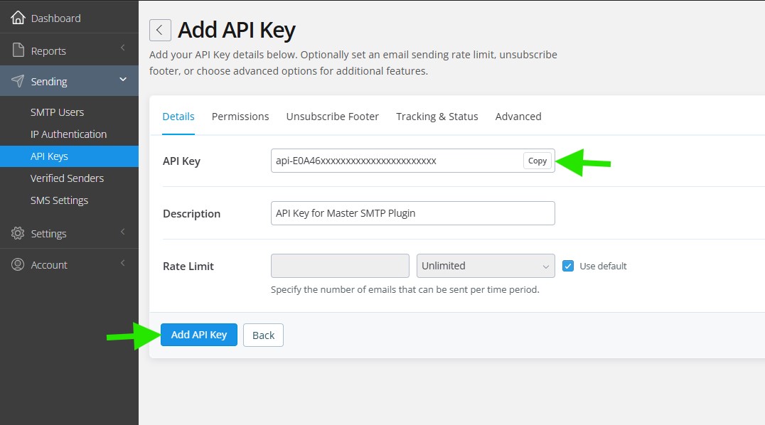 First, copy the generated API Key and save it in a safe place. You will need it later in the Master SMTP settings. After that, click Add API Key.