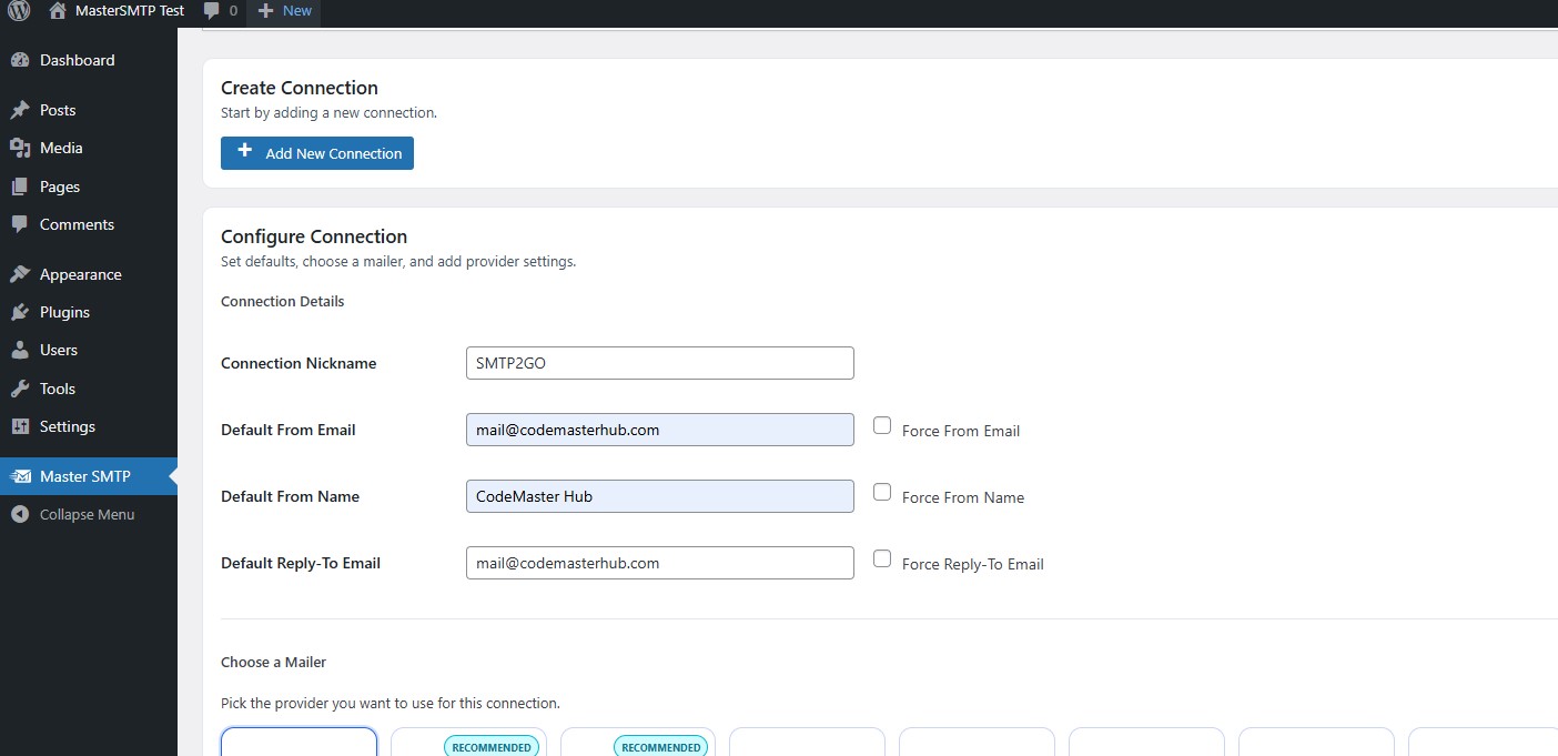 In your WordPress dashboard, go to Master SMTP > Connections, then click Create New Connection.