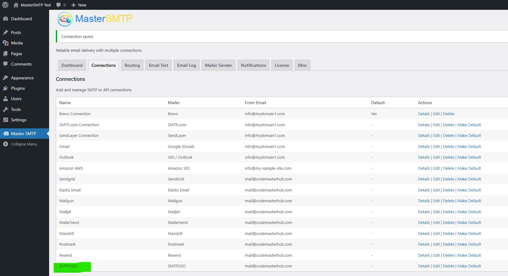 If you want, you can also enable Default Connection to make SMTP2GO your default mailer. When you are done, click Save Connection.