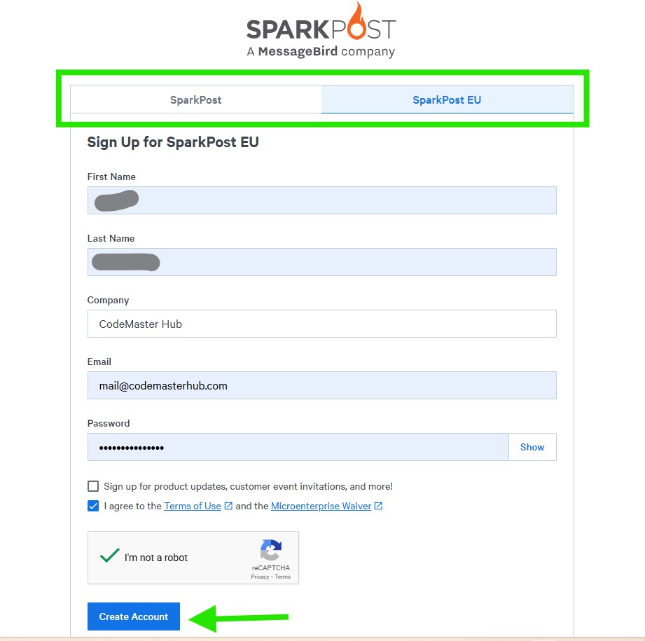 If you are creating a new account, first choose your server region: SparkPost for the US region, or SparkPost EU for the Europe region. If you are located in Europe, select SparkPost EU. Otherwise, select SparkPost.