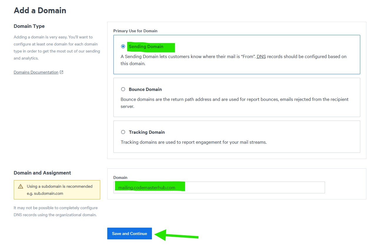 Select Sending Domain as the domain type, then enter your domain name.