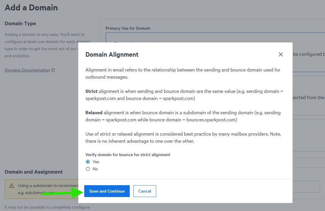 You may also see a Domain Alignment popup. Leave the default option selected, then click Save and Continue.