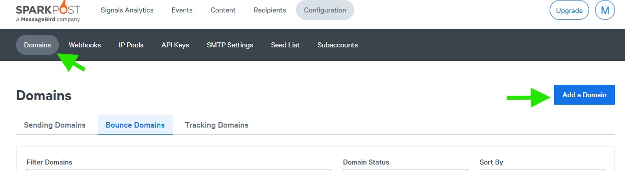 After your sending domain is verified, go to Configuration > Domains, open the Bounce Domains tab, then click Add a Domain.