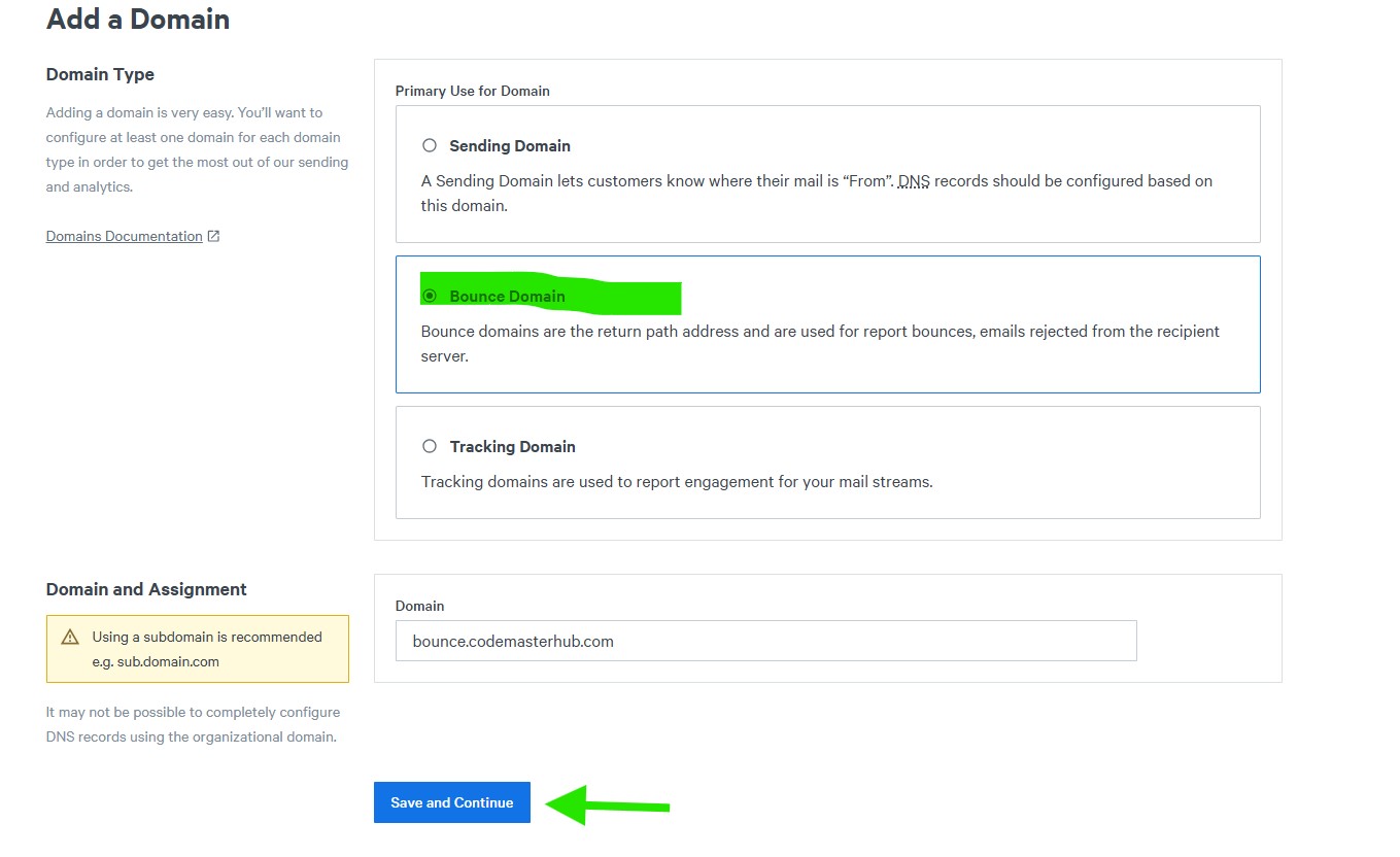 Select Bounce Domain as the domain type, then enter your bounce domain.