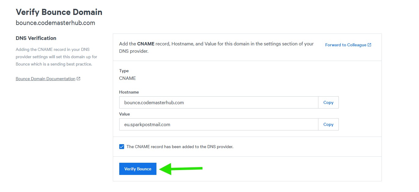 Add the required CNAME record to your DNS provider exactly as shown in SparkPost.