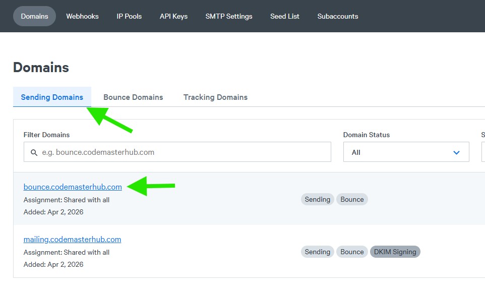 To set your bounce domain as the default one, first go to the Domains page and click your verified bounce domain name.