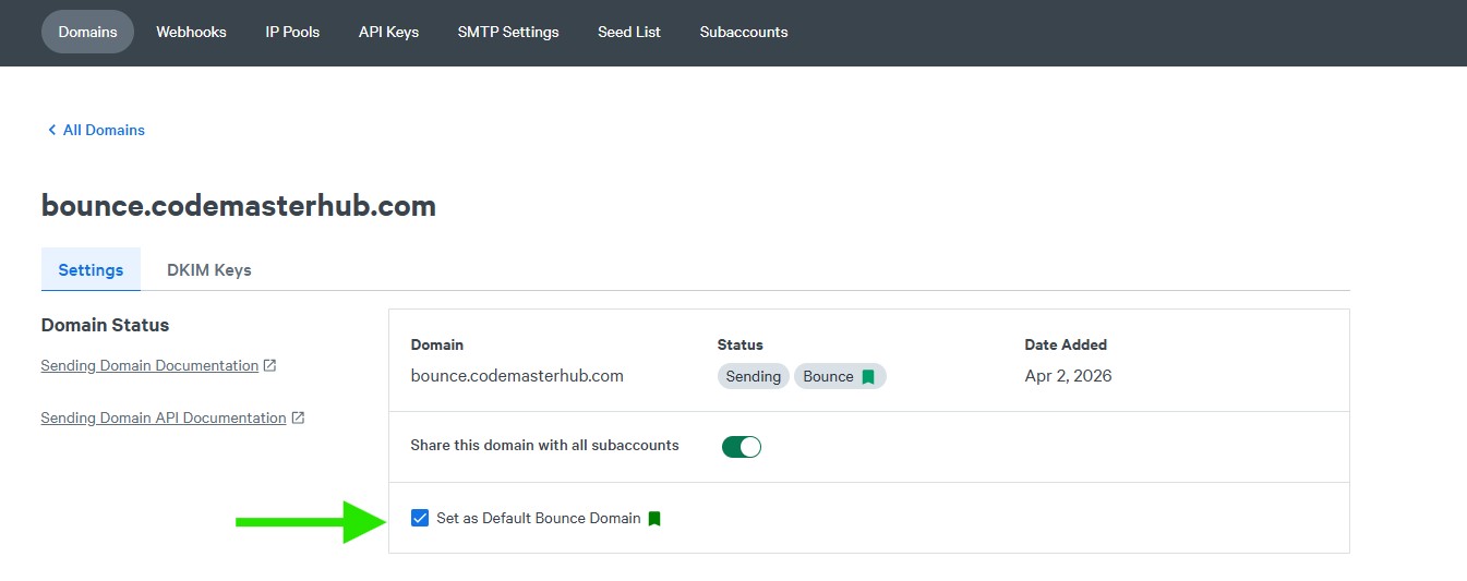 On the domain settings page, enable Set as Default Bounce Domain to use this bounce domain as the default for your SparkPost account.