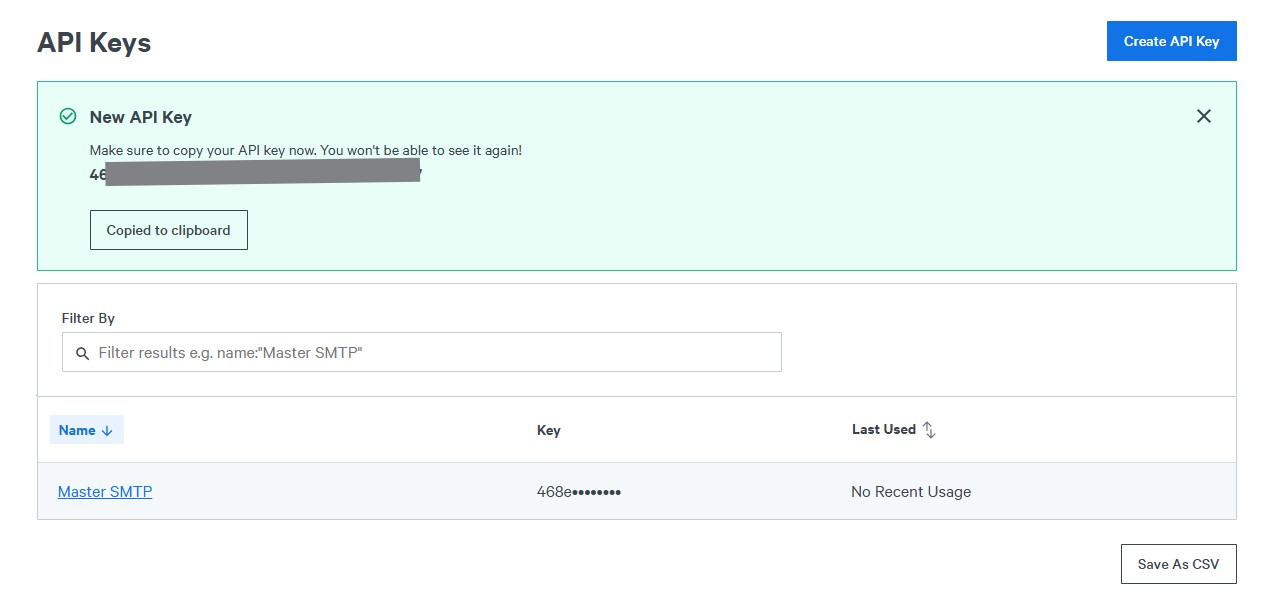 Your new SparkPost API key will be shown only once after creation. Copy it and save it in a safe place, because you will need it in the next step when configuring SparkPost in Master SMTP.