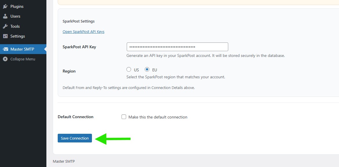 Enter your SparkPost API Key. For Region, select US or EU to match the SparkPost account region you selected when creating your account. If you want to use this as your main mailer, enable Make this the default connection. Finally, click Save Connection.The connection will be added to the Connections list, and you should see Connection saved. at the top of the window.